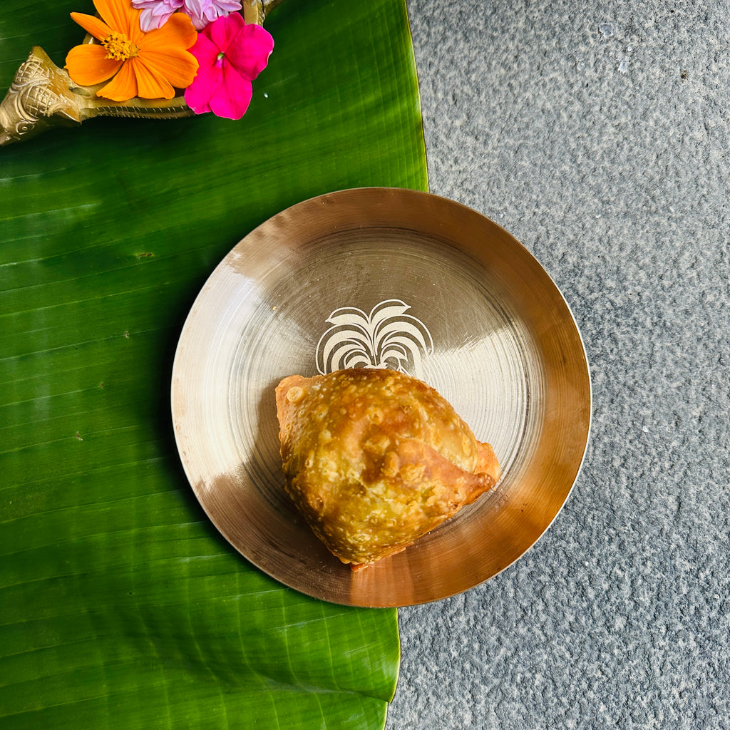 Our Kansa Collection is a fusion of tradition and innovation. The Snack Plate has been crafted by skilled tribal artisans. Kansa is an alloy of 78% Copper and 22% tin and is celebrated for its remarkable attributes. Beyond its health benefits, Kansa's natural heat conductivity keeps food warm and flavours intact. Cherished since ancient times for its gut-friendly properties, Kansa has also found its place in Indian temples.