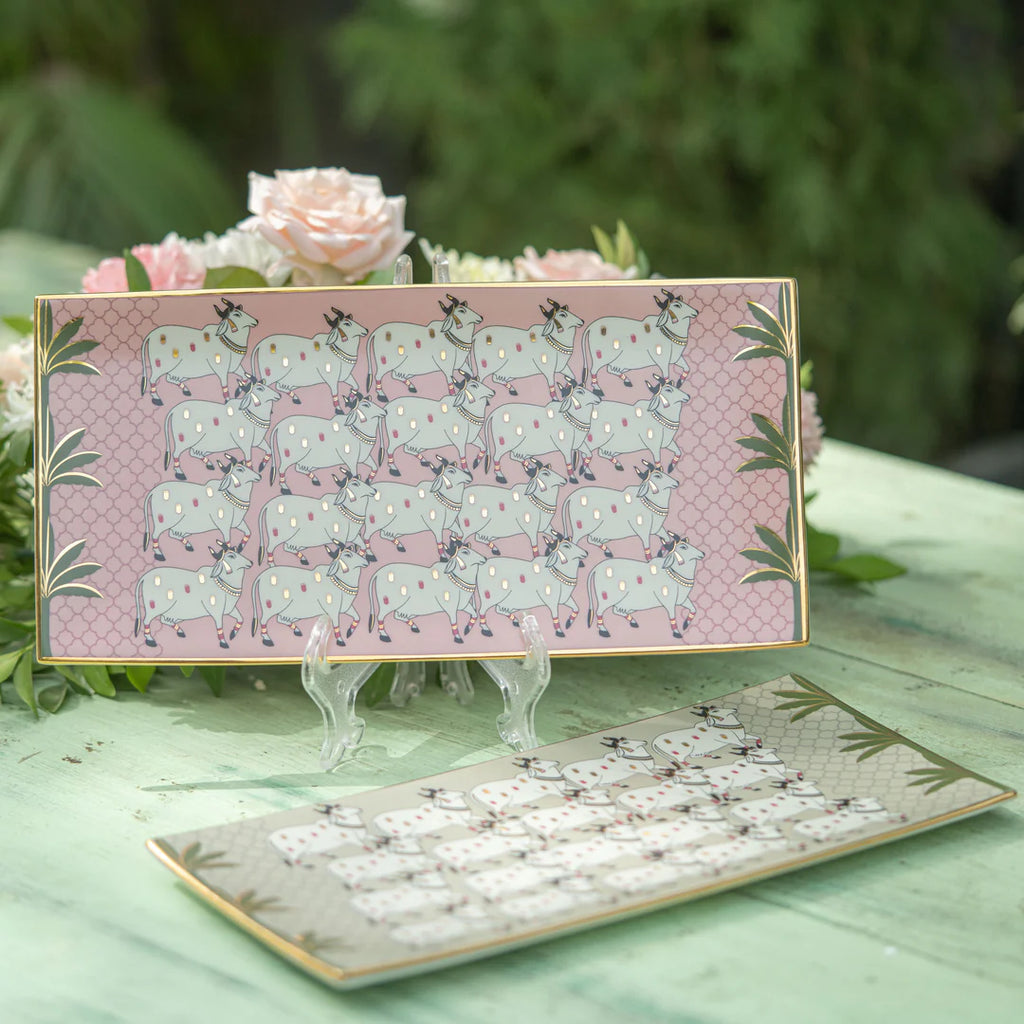 Made from sturdy, sleek & lightweight fine bone china. Pichwai Git Set has been hand decorated with lotus, tree, bird & cow motifs in green & pink hues inspired by traditional Pichwai paintings that symbolize eternal Krishna bhakti and is highlighted with 24-karat gold. They undergo three stages of firing and stringent quality check to attain the finish.
