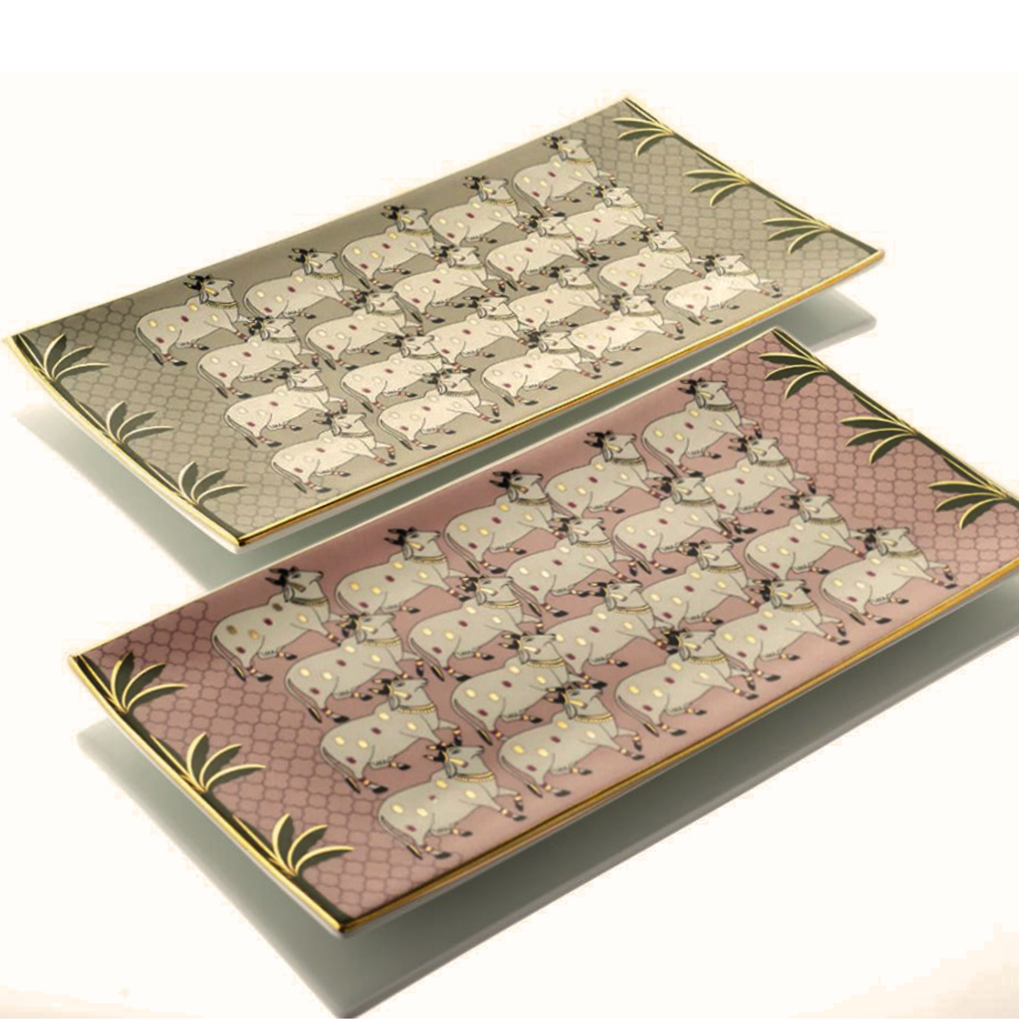 Made from sturdy, sleek & lightweight fine bone china. Pichwai Cookie Plate has been hand decorated with lotus, tree, bird & cow motifs in green & pink hues inspired by traditional Pichwai paintings that symbolize eternal Krishna bhakti and is highlighted with 24-karat gold. They undergo three stages of firing and stringent quality check to attain the finish.